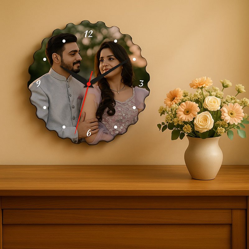 Perfect for adding a personal touch to your home or gifting someone special, this curved-edge round clock blends softness with sophistication. Customize it with your photo and create a timeless piece of decor.