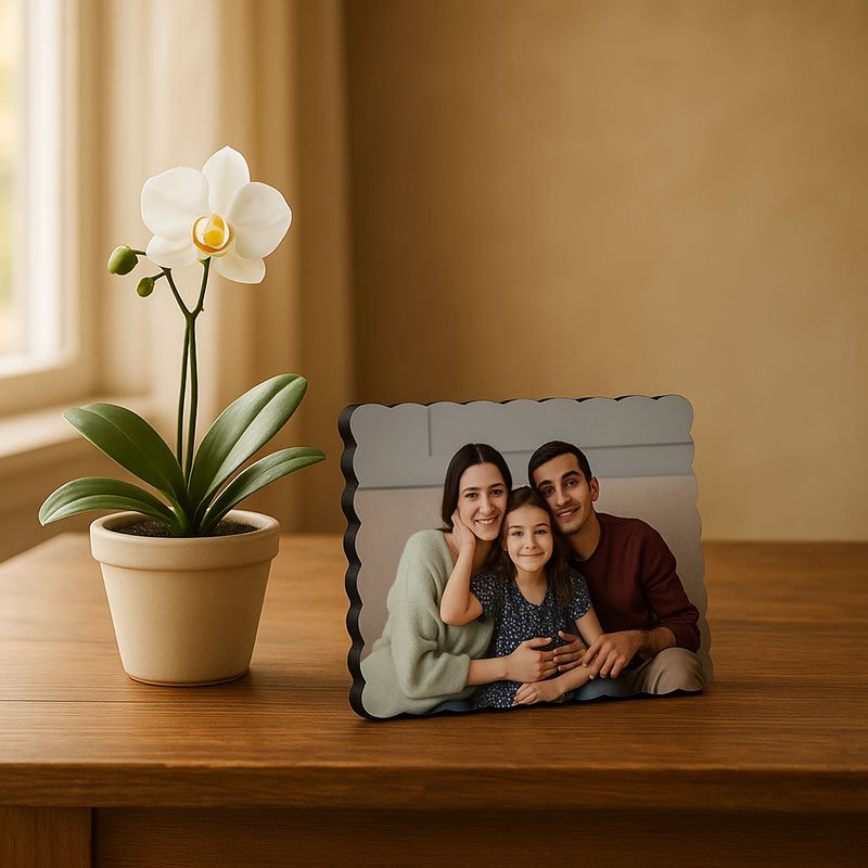 Capture warmth and togetherness in this beautifully crafted Scallop Edge Table Frame, perfect for showcasing your best family moments. Made from durable 12mm MDF and finished with a high-gloss photo print, it adds a soft, artistic feel to any space.